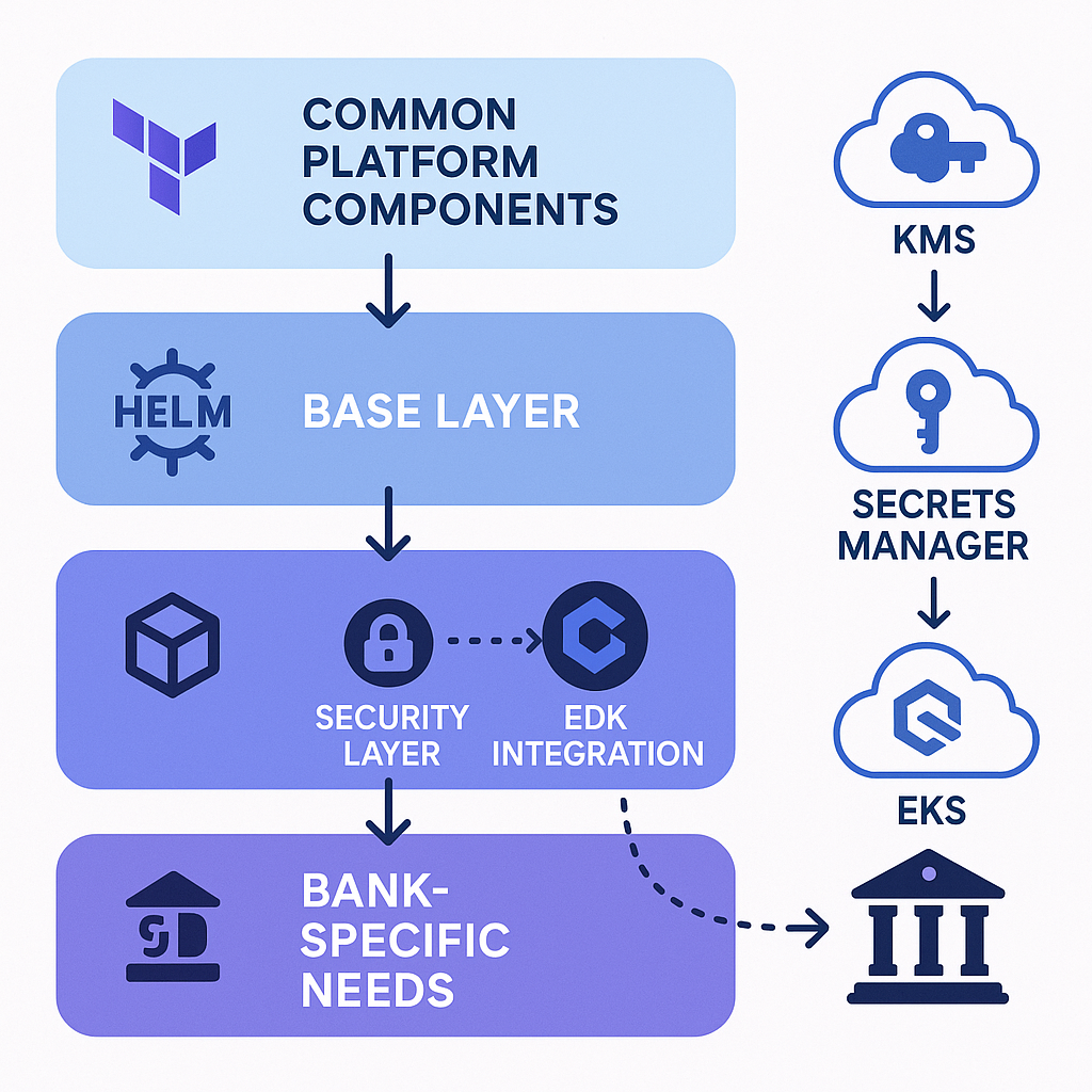 We implemented a two-layered Terraform Infrastructure as Code (IaC) architecture that separated common platform components from bank-specific customizations. This approach provided a solid foundation while maintaining flexibility for unique client requirements.